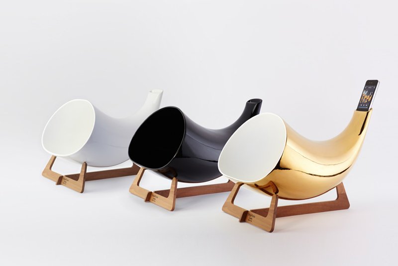 Cada uno de los Megaphones está realizado de una forma totalmente artesanal en cerámica pulida. Este material es el que le da ese toque tan elegante a esta creación. La base más angosta del altavoz está realizada con madera fina.