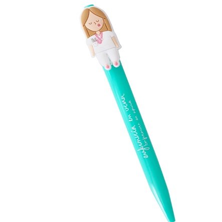 El bolígrafo pinta muy bien, pero lo que más la gustará es el muñeco en forma de enfermera en la parte superior del boli. En el boli se integra un mensaje de optimismo. Mientras que el boli se abre y se cierra a través de un sencillo click.