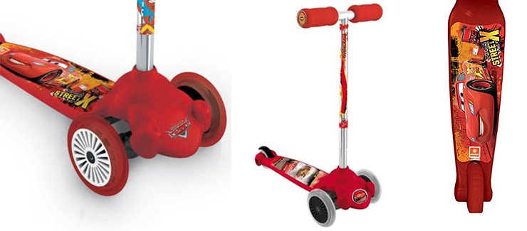 A diferencia de otros modelos tradicionales, el patinete de Cars 2 dispone de dos ruedas delanteras y una sola atrás, lo que lo hace más estable, seguro y de conjunto con una práctica inclinación de su eje delantero, más cómodo para las curvas.