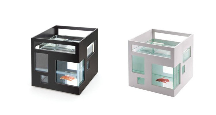 La estructura de la pecera es de plástico y de cristal resistente. Sus dimensiones son 19 x 19 x 20 cm. y su recipiente interior es extraíble para facilitar su limpieza. Tienes dos colores para elegir. El precio de esta original pecera es de 45 euros.