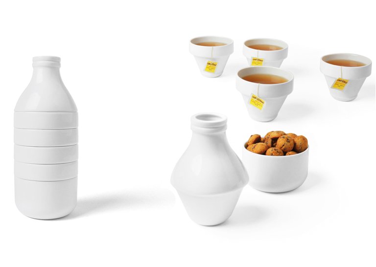 Lo que a primera vista puede parecer una simple botella de leche antigua esconde un completo set de té o café de porcelana de lo más completo. El set se compone de una jarra de leche, cuatro tazas y un bol. Como ves, con esta “botella de leche” tenemos todo lo necesario para tener una agradable merienda.