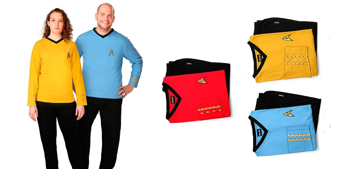 Y es que como podrás ver en la imagen superior estos pijamas imitan el estilo de los uniformes de la Flota Estelar, que marcaban el departamento al cual pertenecía el tripulante de la tripulación dependiendo de sus funciones. Los uniformes rojos pertenecían a los de operaciones, los amarillos a los oficiales y los azules al departamento de ciencia.