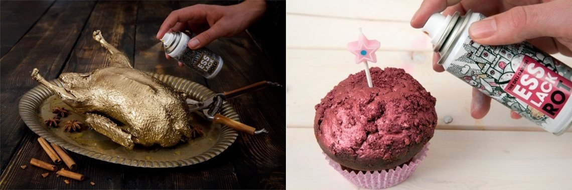 Los tomates son rojos, las lechugas verdes, las patatas blancas, etc. Pero, ¿qué te parecería poderle cambiar el color a los alimentos? Con el spray que presentamos hoy vas a poder conseguirlo. Dicen que los alimentos entran primeramente por la vista, así que ahora ésta no va a saber que pensar al ver un pollo asado de color rojo o una madalena tintada de color oro.